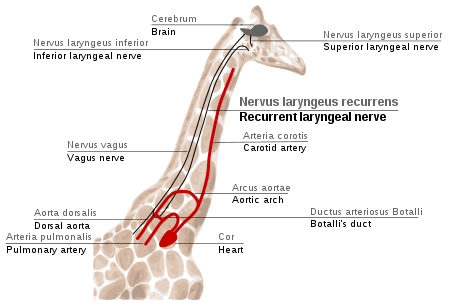 המסלול של עצב בית הקול אצל ג'ירפה (באדום) | מקור: Vladimir V. Medeyko, Wikipedia