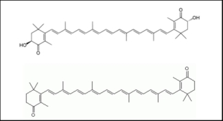 למעלה: אסטאקסנטין (astaxanthin, E161j); למטה: קנטאקסנטין (canthaxanthin, E161g).