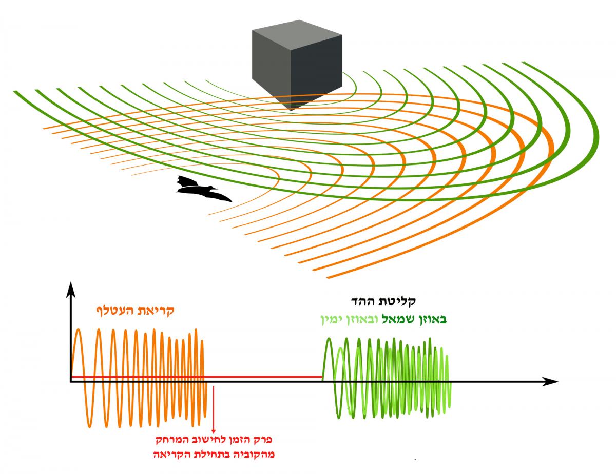 מנגנון האקו-לוקיישן: הזמן בין הקריאה להד מעיד על מרחק העצם המחזיר. ההפרש בין זמני ועוצמות הקליטה בשתי האוזניים מעיד על כיוון העצם המחזיר (מבוסס על תרשים מויקיפדיה).