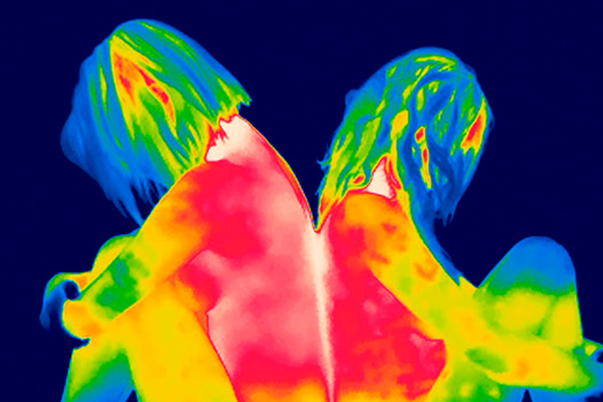 כל גוף שהטמפרטורה שלו גבוהה מהאפס המוחלט פולט קרינה אלקטרומגנטית שתלויה רק בטמפרטורה שלו. קרינה תת-אדומה שנפלטת מהגוף של שתי נשים | Thierry Berrod, Mona Lisa Production / Science Photo Library