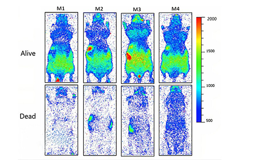 אחרי מותם של העכברים פליטת הפוטונים לא נעלמה מיד אלא דעכה בהדרגה. פליטת הפוטונים מעכברים חיים (למעלה) ומתים | NRC's Human Health Therapeutics Research Centre