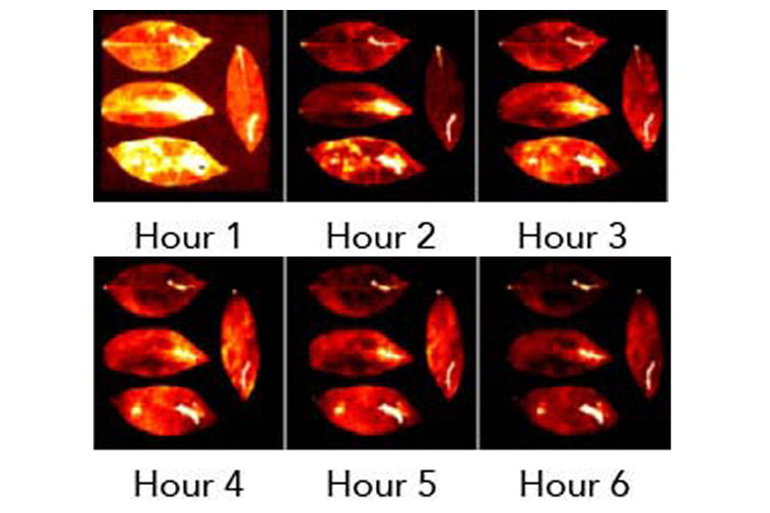 כשפצעו את עורקי העלים באופן מבוקר, נרשמה עלייה מקומית וברורה ברמת התאורה של התאים באזור הפגיעה. העלים הפצועים | NRC's Human Health Therapeutics Research Centre
