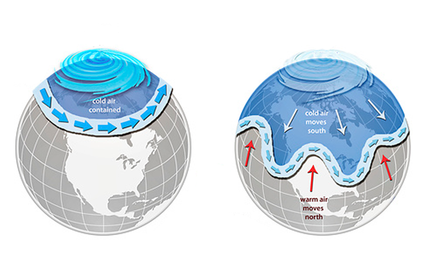 כאשר המערבולת חזקה במיוחד, היא נוטה להישאר קרוב לקוטב ולהקטין את הגלים של זרם הסילון (באיור משמאל). כאשר המערבולת נחלשת או משנה צורה, היא עשויה להגדיל את הפיתולים של זרם הסילון, ולגרום למזג אוויר קיצוני (מימין) | NOAA