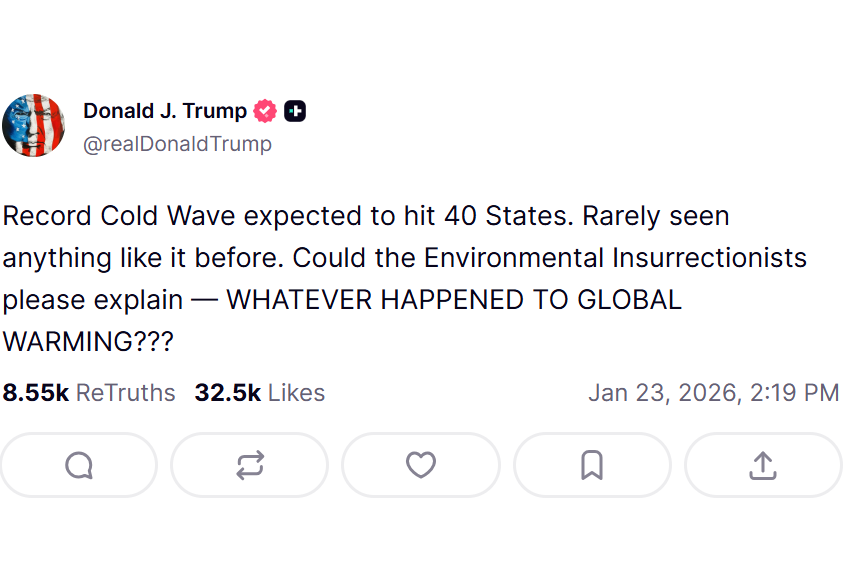 מה קרה להתחממות הגלובלית?! הפוסט של הנשיא טראמפ ברשת Truth Social | צילום מסך