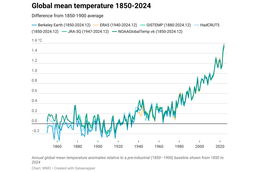 מגמה של חימום העולם היא חדה וברורה: בעשרות השנים האחרונות כל שנה הייתה חמה ביחס לשנים לפני המהפכה התעשייתית. גרף המראה את הטמפרטורה העולמית הממוצעת, מ-1850 עד 2020 | World Meteorological Organization