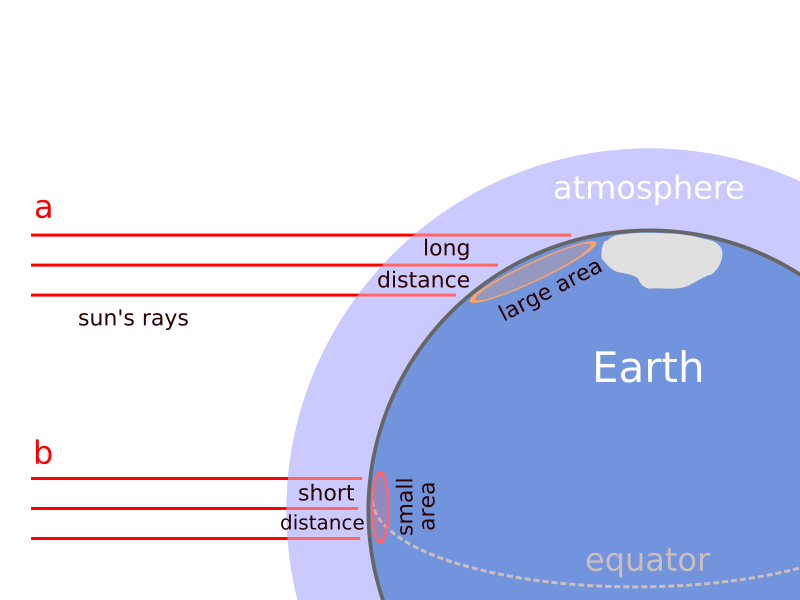 בקיץ השמש מצויה בצהריים ברום השמים (זנית או נדיר בעברית) והמרחק אותם עוברים הקרניים באטמוספרה הוא הקטן ביותר. בנוסף קרני השמש פוגעים בקרקע בזווית של כמעט 90 מעלות בשטח קטן יחסית לכן האנרגיה ליחידת שטח גבוהה. בחורף לעומת זאת השמש מצויה יותר נמוך בצהרי היום ולכן קרניה עוברות מרחק רב יותר באטמוספרה וזווית הפגיעה שלהם גורמת להם להתפזר על שטח גדול יותר ולכן האנרגיה ליחידת שטח קטנה יותר.