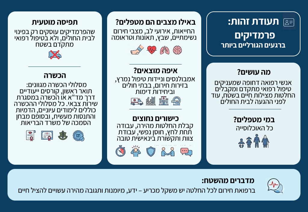 פרמדיקים הם לעיתים הראשונים להגיע לזירת אירוע רפואי דחוף, עוד לפני הקליטה במיון או בחדר הטראומה, והם נדרשים להפעיל שיקול דעת רפואי ולהחליט בזריזות כיצד לטפל – החלטה שיש לה משמעות קלינית מכרעת. מדובר באנשי רפואה דחופה בעלי הכשרה ייחודית, שמוסמכים להעניק טיפול רפואי מתקדם מחוץ לסביבה המבוקרת של בית החולים.