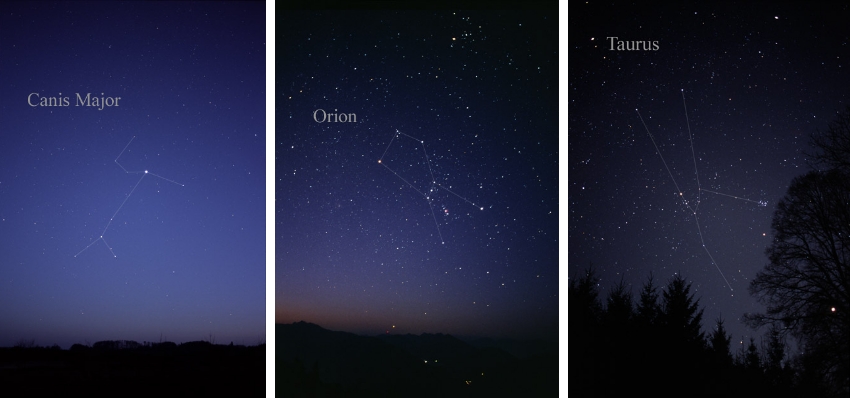 הקבוצות שאנחנו רואים בשמי הלילה משתנות לפי עונות השנה, וכך הן סימנו לבני האדם את בוא החורף או הקיץ. משמאל לימין – קבוצות הכוכבים שור, אוריון, וכלב גדול | ויקימדיה, Till Credner