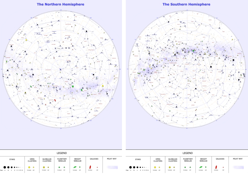 הקבוצות שנוכל לראות תלויות במידה רבה במיקום שלנו על פני כדור הארץ. הכוכבים שנראים מחצי הכדור הצפוני (משמאל) והדרומי | ויקימדיה, Roberto Mura