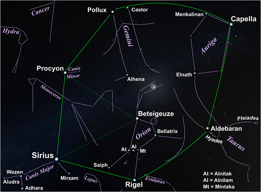 המשושה מורכב משישה כוכבים בהירים שיוצרים צורת משושה: קאפלה, אלדברן, ריג'ל, סיריוס, פרוקיון וקסטור או פולוקס | ויקימדיה, Stellarium