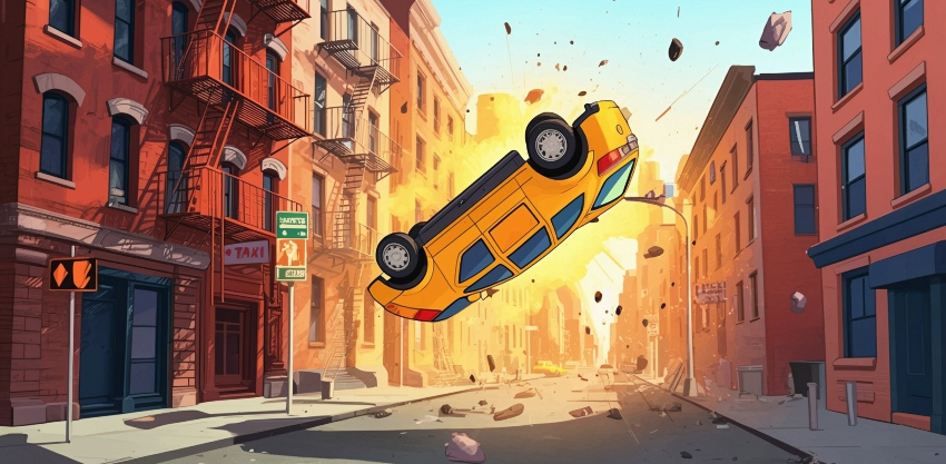 The blast wave hurls objects away from the explosion source — just like in action films. A car is thrown into the air due to an explosion in an animated movie | Illustration: Shutterstock AI