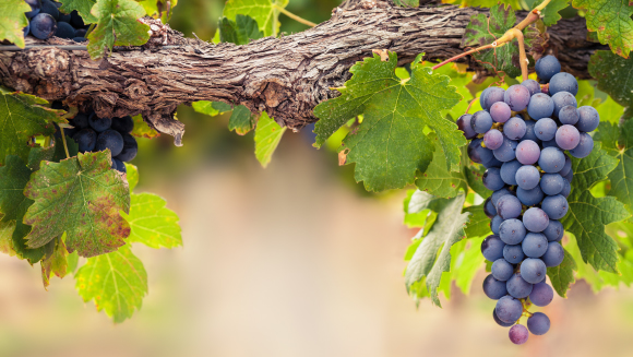 A culturally significant agricultural crop. Ripe grapes suspended from a vine | Andrew Hagen, Shutterstock