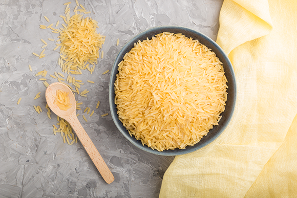 A rice variety developed to combat vitamin A deficiency and the most famous example of biotechnological biofortification – golden rice. Ceramic bowl with raw golden rice. Image: uladzimir zgurski, Shutterstock