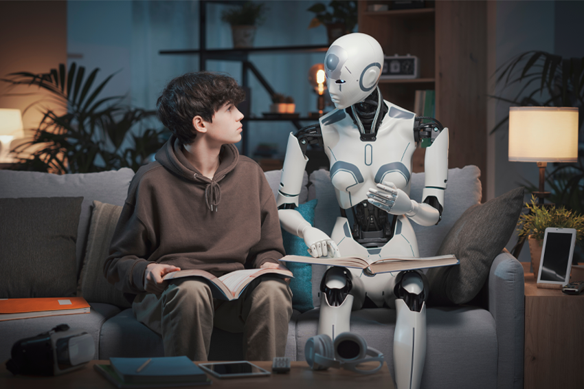 AI tools should be used thoughtfully and guided by human intelligence—rather than relied on automatically. A child and a robot studying together | Shutterstock, Stock-Asso
