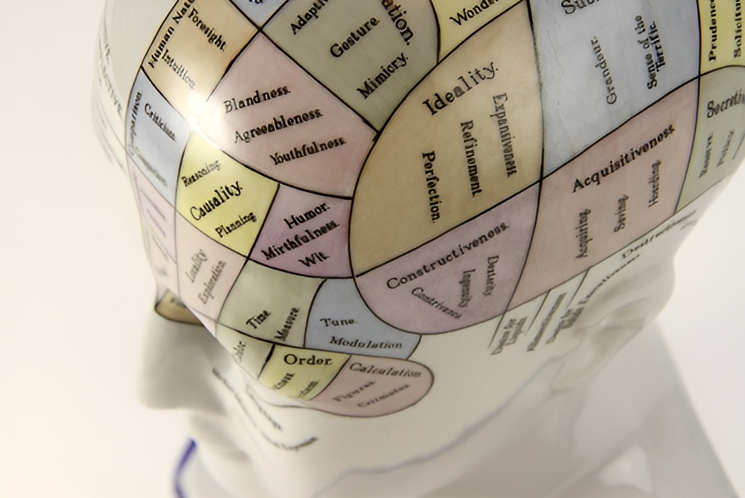 Phrenology: A 19th-century pseudoscientific theory linking skull shape to human character and personality traits. A sculpture showing character traits and their location on the skull | Science Source / Science Photo Library