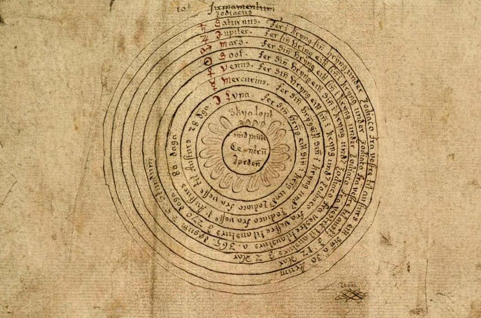 The perception called the “geocentric model” aligns well with everyday human experience. Geocentric map of the universe from Iceland, 18th century | Wikipedia, public domain