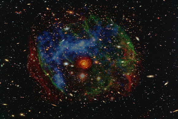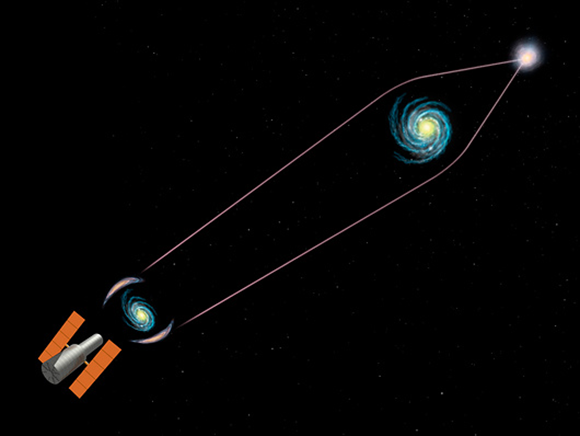 The mass of the cluster is so great that it can serve as a lens and focus distant light coming from behind it. The principle of gravitational lensing | Julian Baum / Science Photo Library.