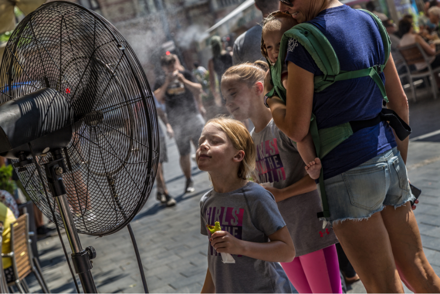 In 2022, a series of heatwaves in Europe led to the deaths of more than sixty thousand people. A family cooling off in front of a fan during the heat | Andocs, Shutterstock