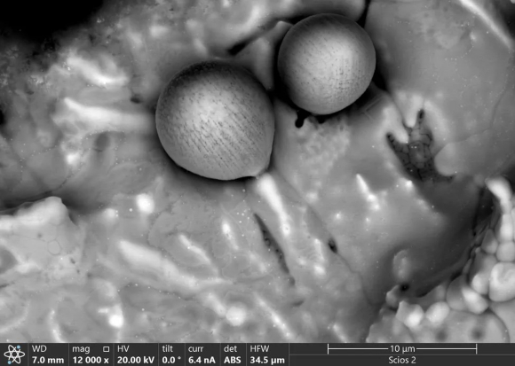 IMspherules –  Minuscule spherules measuring only a few thousandths of a millimeter across. An electron microscope image of two such spherules discovered by the research team | Source: Avi Loeb, Harvard University