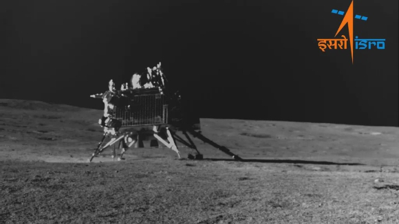 First measurements yield interesting results. The Vikram landing, as captured by the Pragyan rover. The probe's arm is visible close to the left landing leg | Source: ISRO.