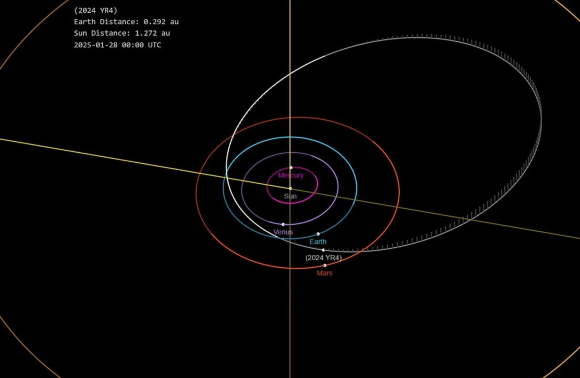 The asteroid could cause significant damage, but the risk of impact remains relatively low. The calculated orbit of asteroid 2024 YR4 relative to Mercury, Venus, Earth, Mars, and Jupiter. Source: NASA/JPL.