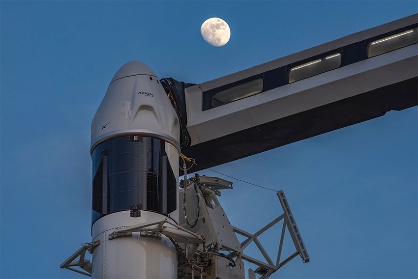 Not launching just yet. The AX-4 Dragon spacecraft atop SpaceX’s Falcon 9 at Kennedy Space Center, Florida | Photo: SpaceX