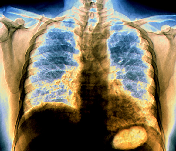 Lung tissue is damaged and replaced with connective tissue. X-ray image of a pulmonary fibrosis patient | Zephyr / Science Photo Library