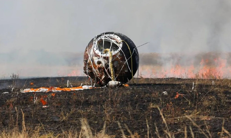 Fresh science from space: the Bion-M No. 2 animal capsule shortly after landing in the Orenburg steppe, as crews extinguish a small grass fire ignited by the spacecraft | Photo: Roscosmos / Ivan Timoshenko