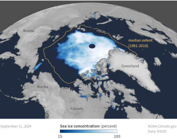 The first Arctic summer with nearly ice-free conditions in the Arctic Ocean may arrive much sooner than previously thought. Satellite image of the Arctic Ocean and its ice cover in summer 2024. Yellow line shows the median ice extent from 1981 to 2010 | NOAA, NSIDC