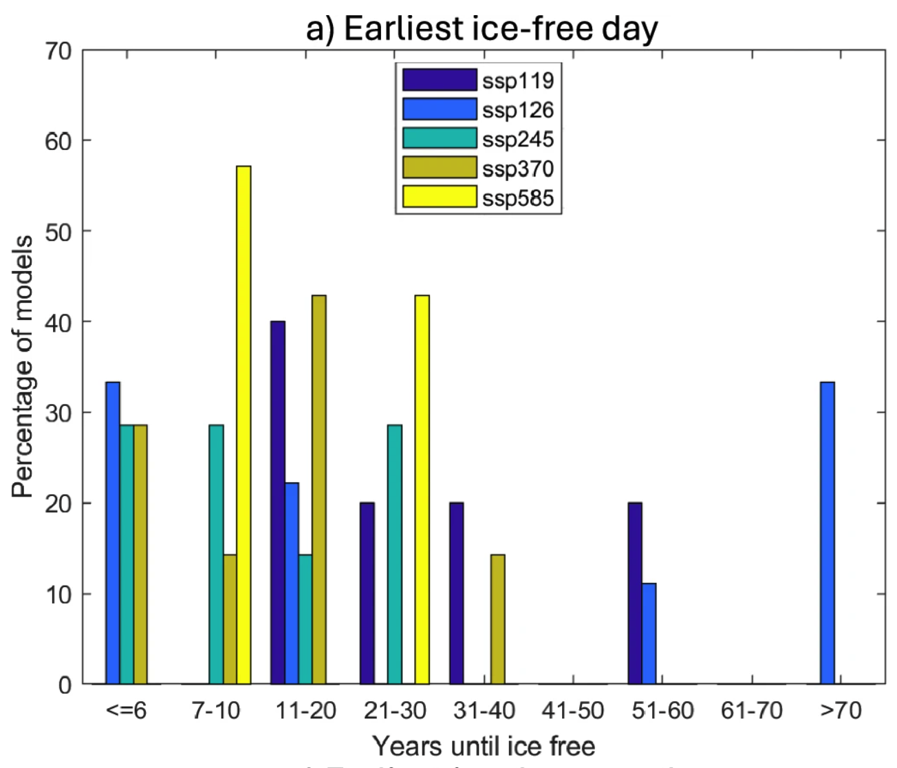 The researchers generated 366 different projections to explore a wide range of climate scenarios. The graph shows the percentage of models predicting a sea ice-free day within a given number of years. Colors represent different carbon emission scenarios: low emissions (blue), high emissions (yellow) | From Heuzé, C., et al., Nat Commun 2024