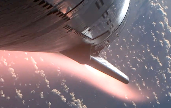 Focusing on the re-entry challenge. A plasma halo is clearly visible near the heat shield during the spacecraft's re-entry in the previous test, before its incineration and disintegration| Photo: SpaceX
