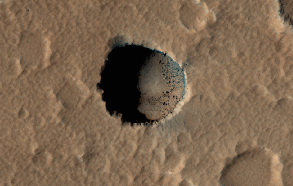 Couls this be one of the Martian counterparts of the Golan Heights “Jubas”? A satellite image of a pit on Mars that was likely formed by soil collapse | Photo: NASA/JPL/University of Arizona