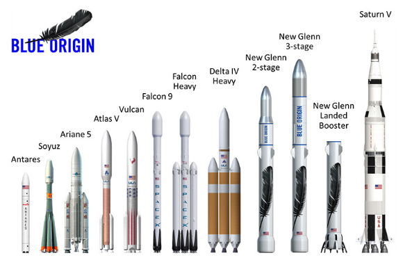 Aiming to compete in the heavy-lift market? Blue Origin illustration shows New Glenn in two-stage and three-stage configurations (and the first stage alone), compared to several other rockets. Starship, not shown in the illustration, dwarfs them all. | Source: Blue Origin