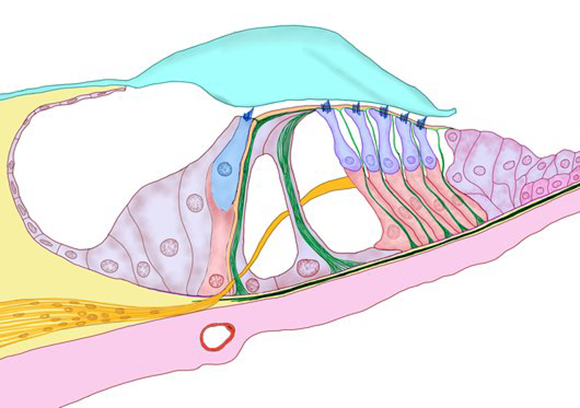 Damage to the activity of the cochlear nerve (orange) may contribute to tinnitus. Corti's organ within the cochlea: Hair cells (blue) respond to sound wave vibrations by transmitting a nerve signal | Illustration: Bo Veisland / Science Photo Library