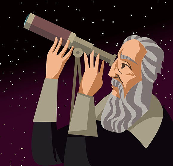 An invention enabling observation of distant objects. Galileo Galilei gazing at the stars through a telescope | delcarmat, Shutterstock