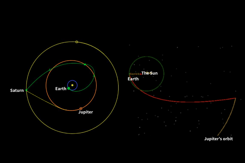 Two possible mission trajectories: entering orbit around Jupiter for three Europa flybys (right), or performing a single Europa flyby, continuing to Enceladus, and returning to Europa (left) | Illustration: Israel Aerospace Industries