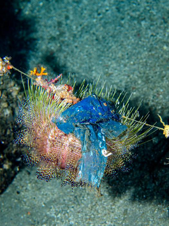 High concentration of plastic particles is also found in deep reefs. A blue plastic bag on a sea urchin, in a reef that is 130 meters deep in the Philippines | Luiz Rocha © California Academy of Sciences