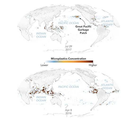 Scientists employ NASA satellites to monitor global microplastic distribution from space. A map illustrating the concentrations of plastic particles in the oceans | NASA's Cyclone Global Navigation Satellite System (CYGNSS)