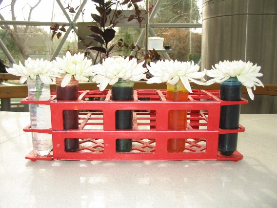 Place each flower in a vessel with some water already dyed with your chosen food colorings, and let soak overnight.