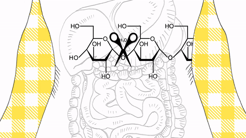 The enzyme amyloglucosidase uses water to break down starch | Illustration: Naama Ziv Hayoun