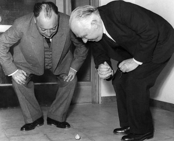 Los ganadores del Premio Nobel Wolfgang Pauli (izquierda) y Niels Bohr juegan asombrados con una peonza tippe-top. Julio de 1954, dominio público