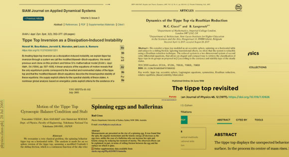 Capturas de pantalla de distintos artículos científicos sobre la (complicada) física de la peonza tippe-top y el huevo que gira.