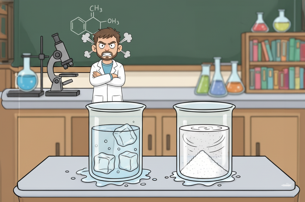 בשני המקרים היה לנו מוצק ונותרנו עם נוזל – אך מבחינה כימית ופיזיקלית מדובר בשני דברים שונים. מדען מסתכל על סוכר נמס וקרח מותך | ליאת פלי באמצעות ג'מיני