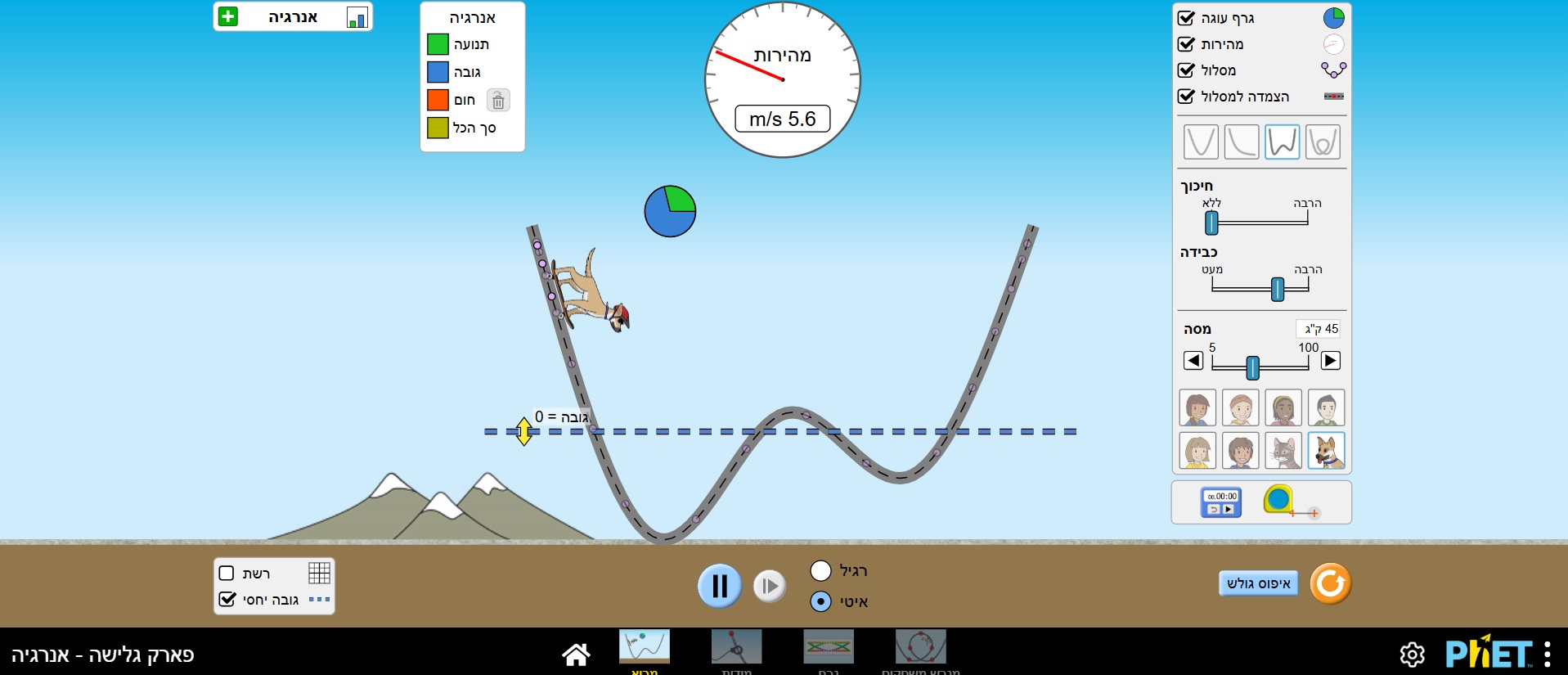 בהתחלה אנו ממליצים לכם להשתמש במסלול המוצא (מסלול דמוי קערה) ולראות איך משקל הגוף, כוח הכבידה והחיכוך משפיעים על התנועה ועל האנרגיה.