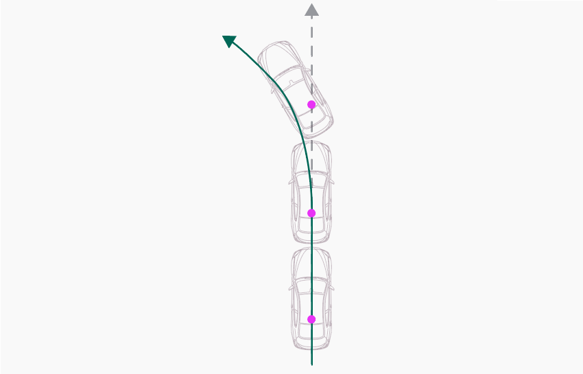 אם נחזור לדימוי המכונית המבצעת פנייה – נוכל להבין מדוע מי שיושב בתוכה מרגיש נדחק לכיוון השני, כפי שמבואר באיור הבא של המכונית הפונה במבט על: