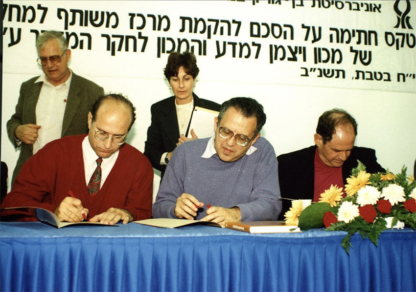 ב-1988 נבחר הררי לתפקיד חייו: נשיא מכון ויצמן למדע. חיים הררי ואבישי ברוורמן חותמים על הסכם לשיתוף פעולה מדעי בין מכון ויצמן ואוניברסיטת בן-גוריון, 1992 | באדיבות אבישי ברוורמן