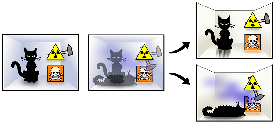 הרעיון הוא שחלקיק יכול להיות בו זמנית בשני מצבים, כפי שחתול לכאורה יכול להיות גם חי וגם מת. הניסוי המחשבתי שמגחיך את עקרון הסופרפוזיציה הפך מזוהה מאוד עם שרדינגר עם השנים | איור: Christian Schirm, Wikipedia