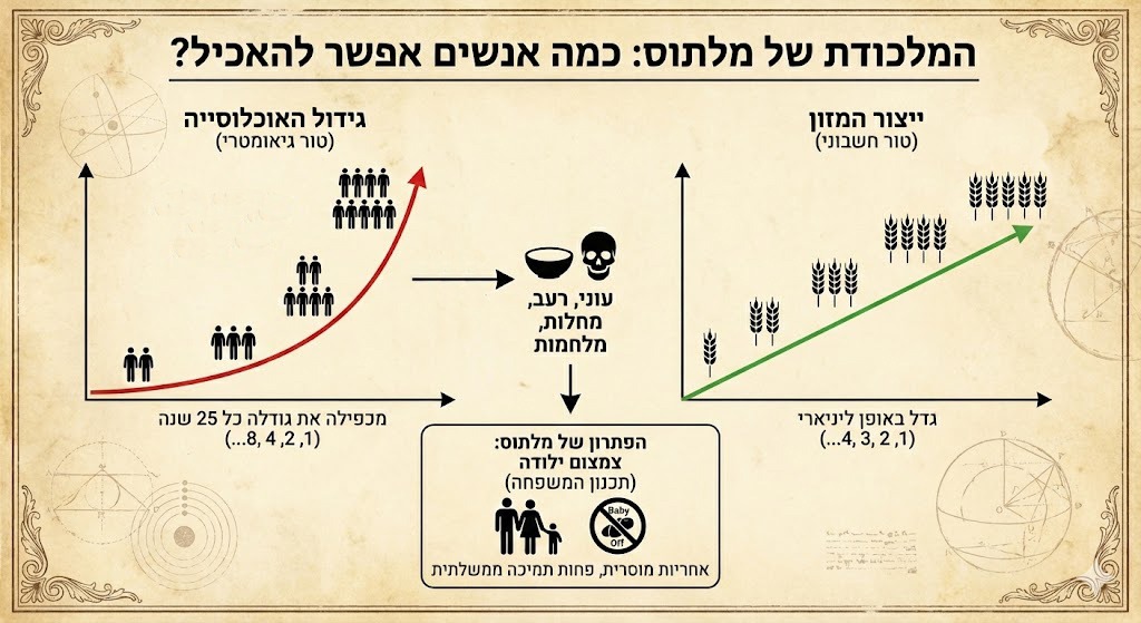 בספרו ניסה מלתוס לפתח מסגרת מדעית ומתמטית שתתאר נאמנה את המציאות החברתית-כלכלית כפי שהוא הכיר אותה. המסר המרכזי העולה ממנו הוא שאוכלוסיית העולם מכפילה את גודלה כל 25 שנה, אך היקף ייצור המזון מתפתח הרבה יותר לאט. במילים אחרות, האוכלוסייה גדלה בטור גיאומטרי, או באופן אקספוננציאלי (מעריכי) – אם בפרק זמן מסוים היא מכפילה את גודלה פי 2, אחרי פרק הזמן הבא היא תהיה גדולה פי ארבעה, ואז פי שמונה וכן הלאה. לעומת זאת, כמות המזון גדלה בטור חשבוני, או באופן ליניארי – כל צעד זהה בגודלו לצעד הקודם. הפער במגמות הללו יגרור בהכרח, לדבריו, עוני, רעב, מחלות ומלחמות. זהו לב ליבה של “המלכודת של מלתוס”, כך שמבחינתו השבחים הרבים שחלק גודווין לצדק ולחינוך הנאור רק מסיחים את הדעת מהגורל העגום הצפוי לאנושות. בהיעדר יכולת להתגבר על פער המשאבים – דינה נחרץ.