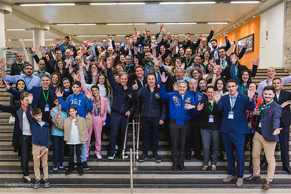 למקסם את הפוטנציאל. אנשי הצוות של משימת AX-1, מארק פאתי, לארי קונור ואיתן סטיבה, עם האסטרונאוטים לשעבר גארט רייזמן ורוברט קבאנה, ומנכ”ל קרן רמון גיל דורון עם משתתפים באירוע הגמר | צילום: אביתר ניסן, קרן רמון