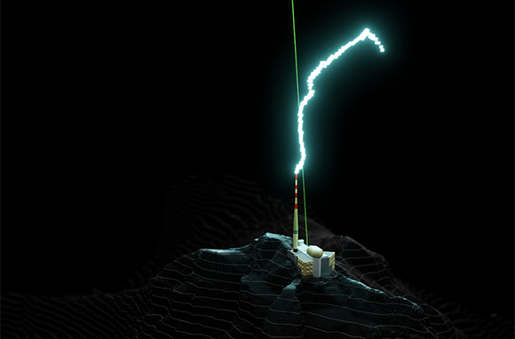 החוקרים מצאו כי הברק עקב אחרי קרן הלייזר לאורך כמה עשרות מטרים לפני שהגיע למגדל התקשורת. הדמיית הניסוי על פסגת הר סנטיס באלפים | מקור: Xavier Ravinet – UNIGE